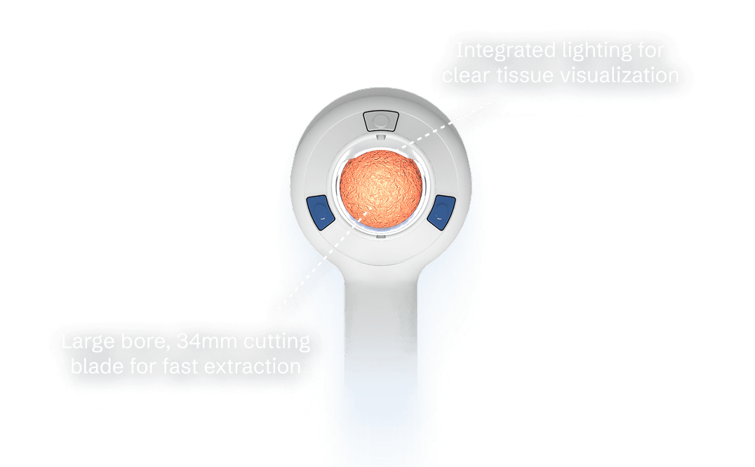 Integrated lighting and blade within the large-bore handpiece enables reliably rapid extraction of large tissue volumes.